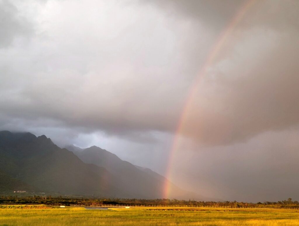 Une petite récompense après toute cette eau qui fait souvent déborder le lit des rivières : un arc-en-ciel au niveau du quartier où l´on habite. Un moment de poésie dans le ciel tourmenté de Calédonie qui vient faire oublier les averses… !