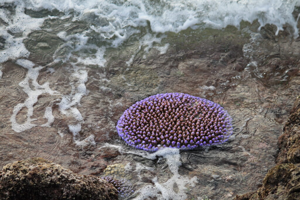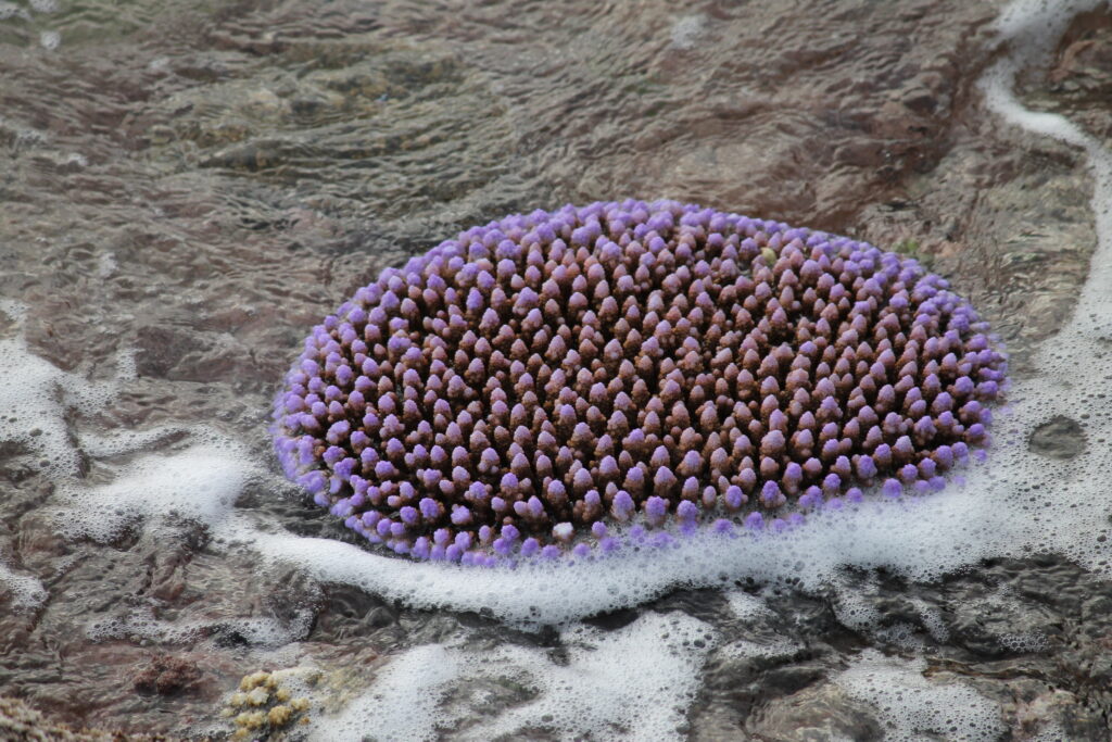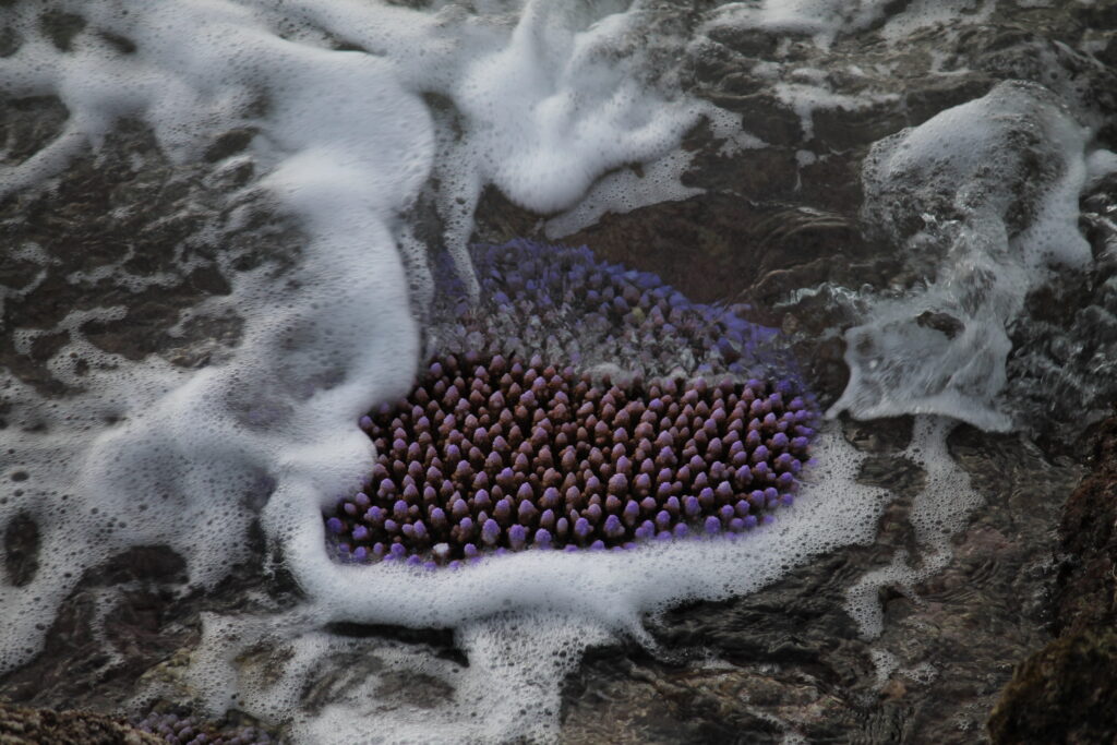 La marée laisse entrevoir des coraux mauves que les vagues couvrent et découvrent comme si elles voulaient à la fois dévoiler et protéger les joyaux qu’elles recèle.