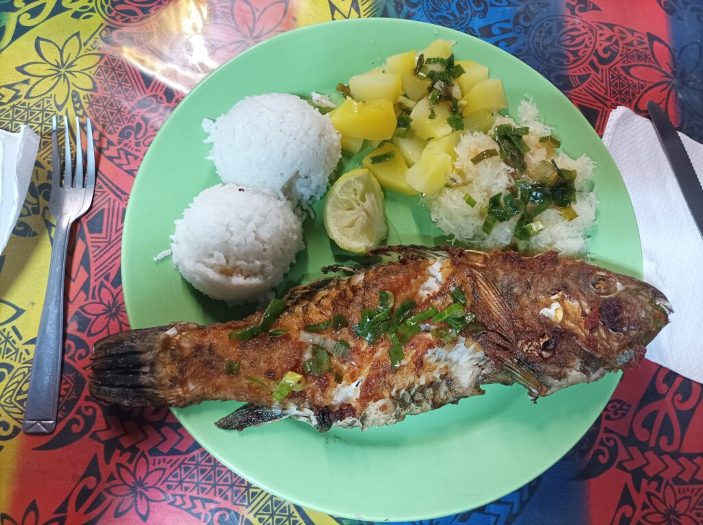 Louise nous a préparé du perroquet avec du riz coco et de la papaye bouillie et en salade. C’est très bon et très copieux! Elle a aussi préparé une salade verte à part et des pommes-liane en dessert.