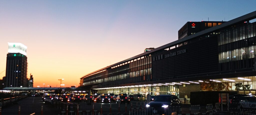 Le soleil se couche sur la station de Shin Osaka.