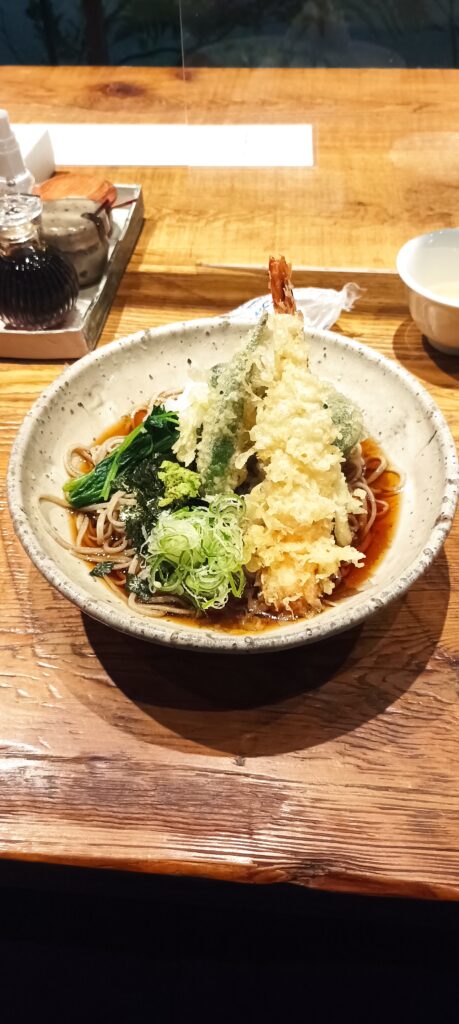 Ce soir-là j’ai testé la soba : des pâtes de sarrasin avec une tempura et de la sauce soja : très bon!