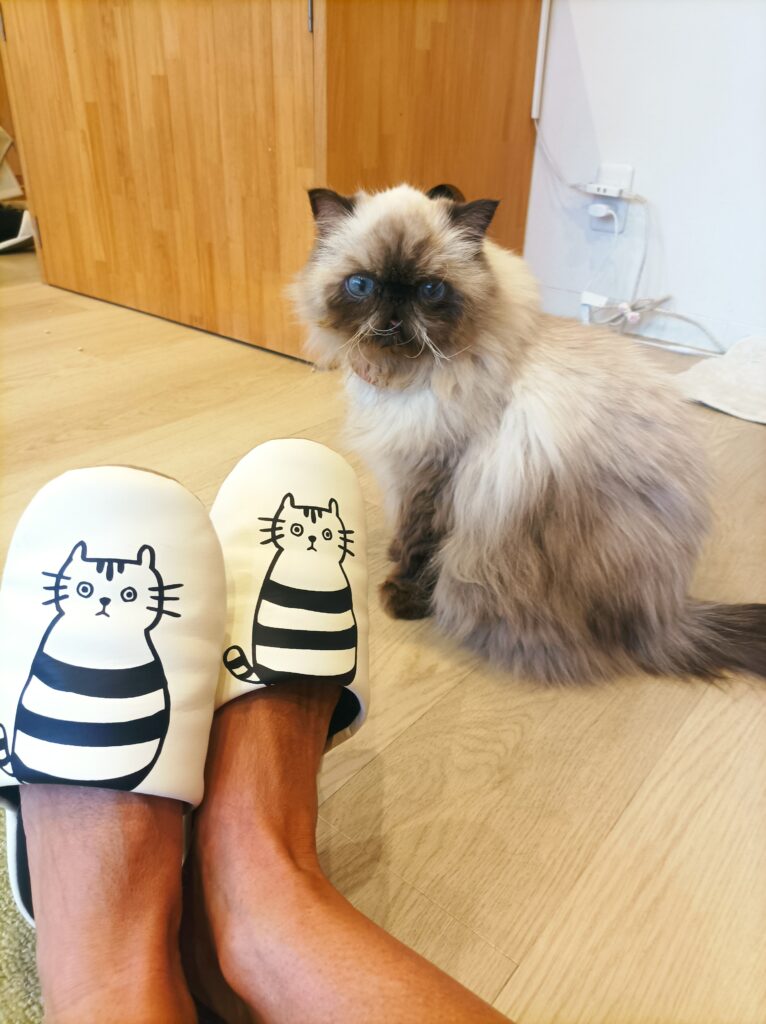On vous donne, comme un peu partout au Japon, des chaussons et un sachet de friandises à donner aux chats.