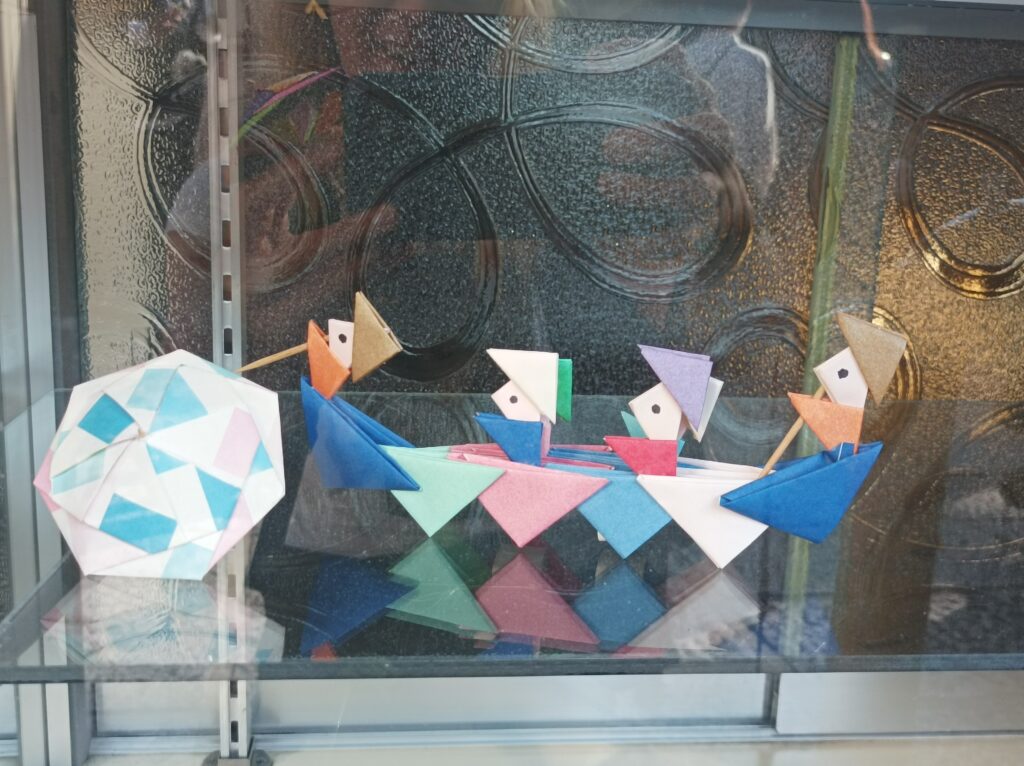Anecdote : Je m’extasiais devant la boutique d’une dame en train de confectionner des décors en origami, je lui ai dit très simplement en japonais que j’aimais son travail, quand d’un coup, la dame s’est levé et m’a aimablement donné un parasol en origami. Un joli moment de partage.