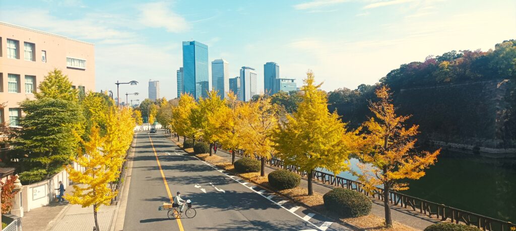 Magnifique contraste entre les buildings, l’allée de ginkos jaunes et la tour du château en contrefort.
